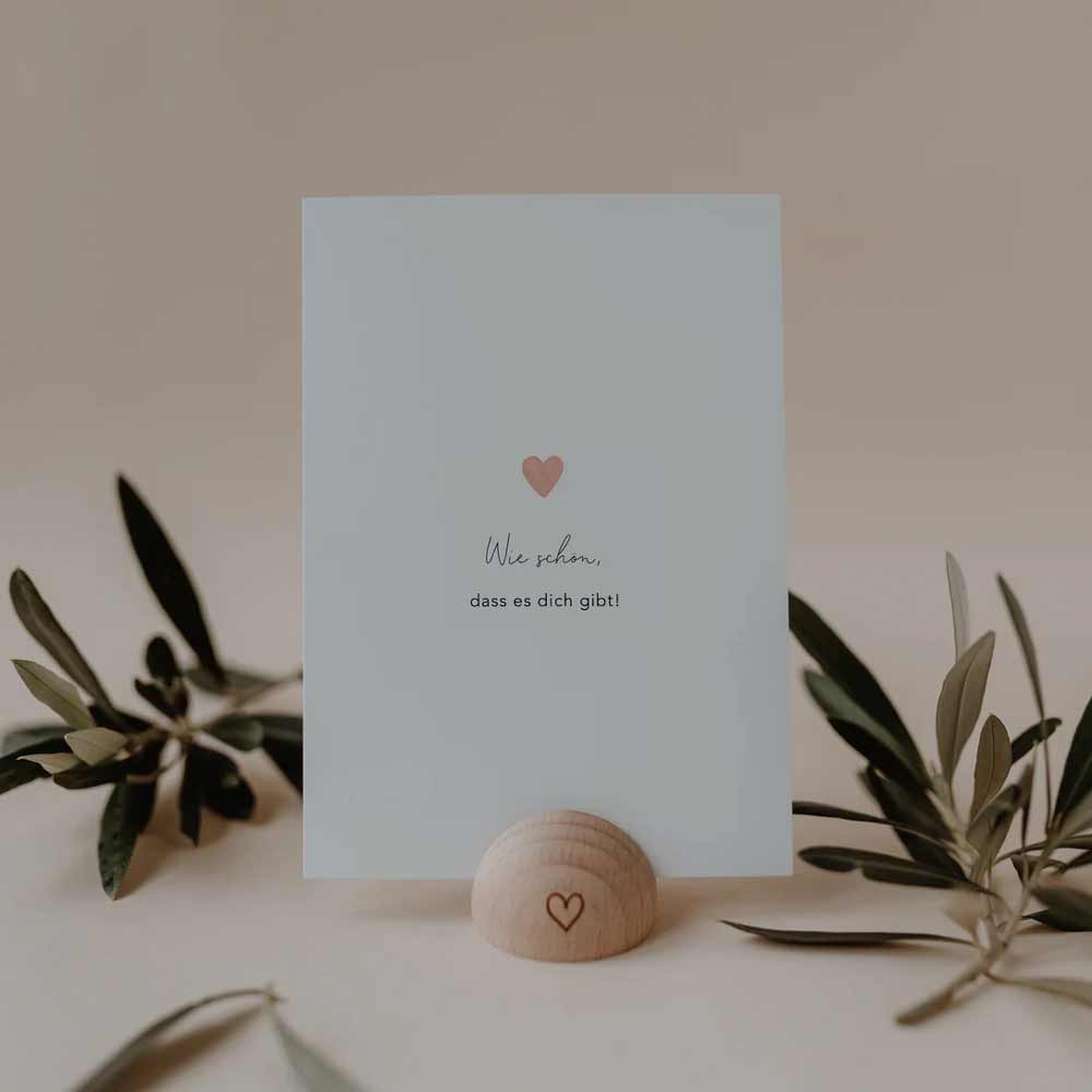 Stell die Karte in einen Holzhalter mit Herzgravur (wie auf den Produktfotos) und kombiniere sie mit Olivenzweigen oder Trockenblumen – so wird aus einem einfachen Gruß eine stilvolle Dekoidee für dein Zuhause oder deinen Geschenktisch.