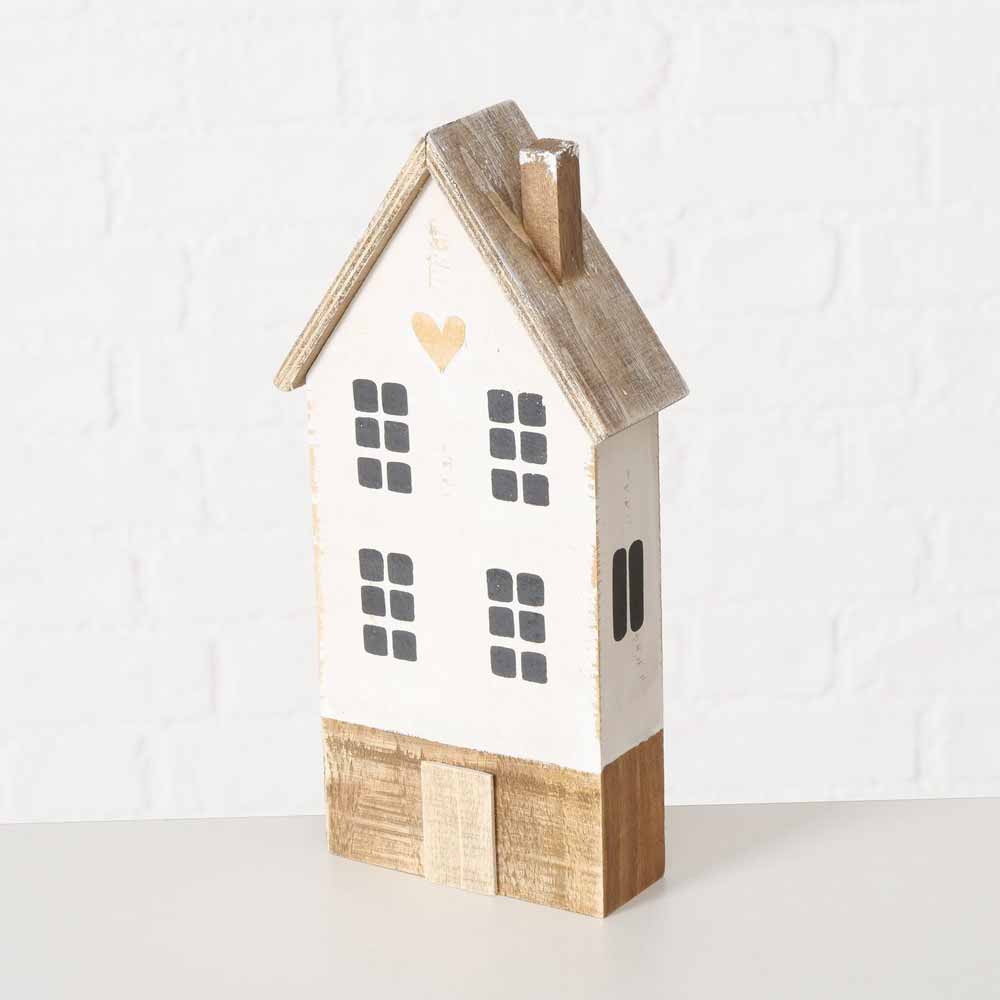 Die Deko-Häuser sind aus hochwertigem Kiefernholz und Sperrholz gefertigt und haben eine liebevolle Bemalung, die ihnen einen einzigartigen Shabby-Chic-Look verleiht. Jedes Haus hat seine eigene Form und Größe, was sie zu einem entzückenden kleinen Dorf arrangiert macht. Besonders das größte Haus mit seinem romantischen Herzmotiv sticht ins Auge.