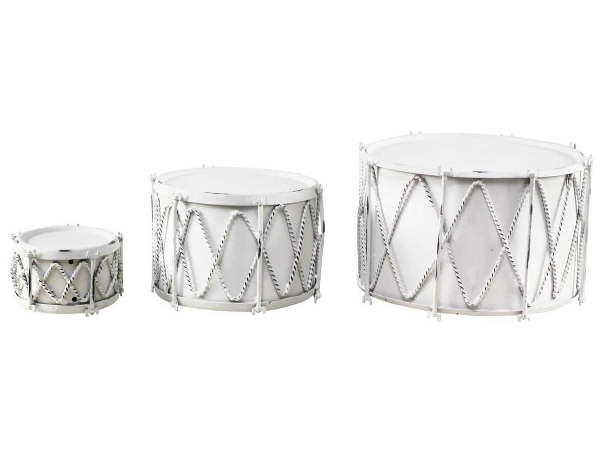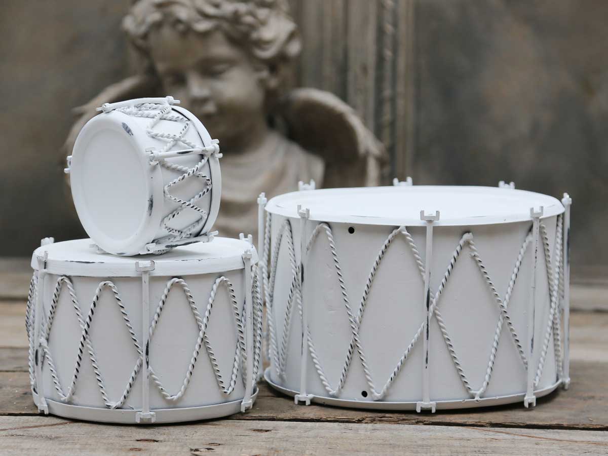 Die Trommel ist sorgfältig gearbeitet: Ein stabiler Korpus in Weiß wird von einem umlaufenden Seilmuster in Zickzack-Optik umspannt, das von silberfarbenen Nieten gehalten wird. Das verleiht dem Stück eine authentische Anmutung, ohne aufdringlich zu wirken. Mit einem Durchmesser von 15 cm und einer Höhe von 11 cm bietet sie genug Präsenz, um allein zu stehen, wirkt aber auch in Gruppen mit anderen Trommeln und Figuren ganz entzückend. Die Vintage-Ästhetik macht sie zum idealen Deko-Element für alle, die den skandinavisch-verspielten Stil lieben.