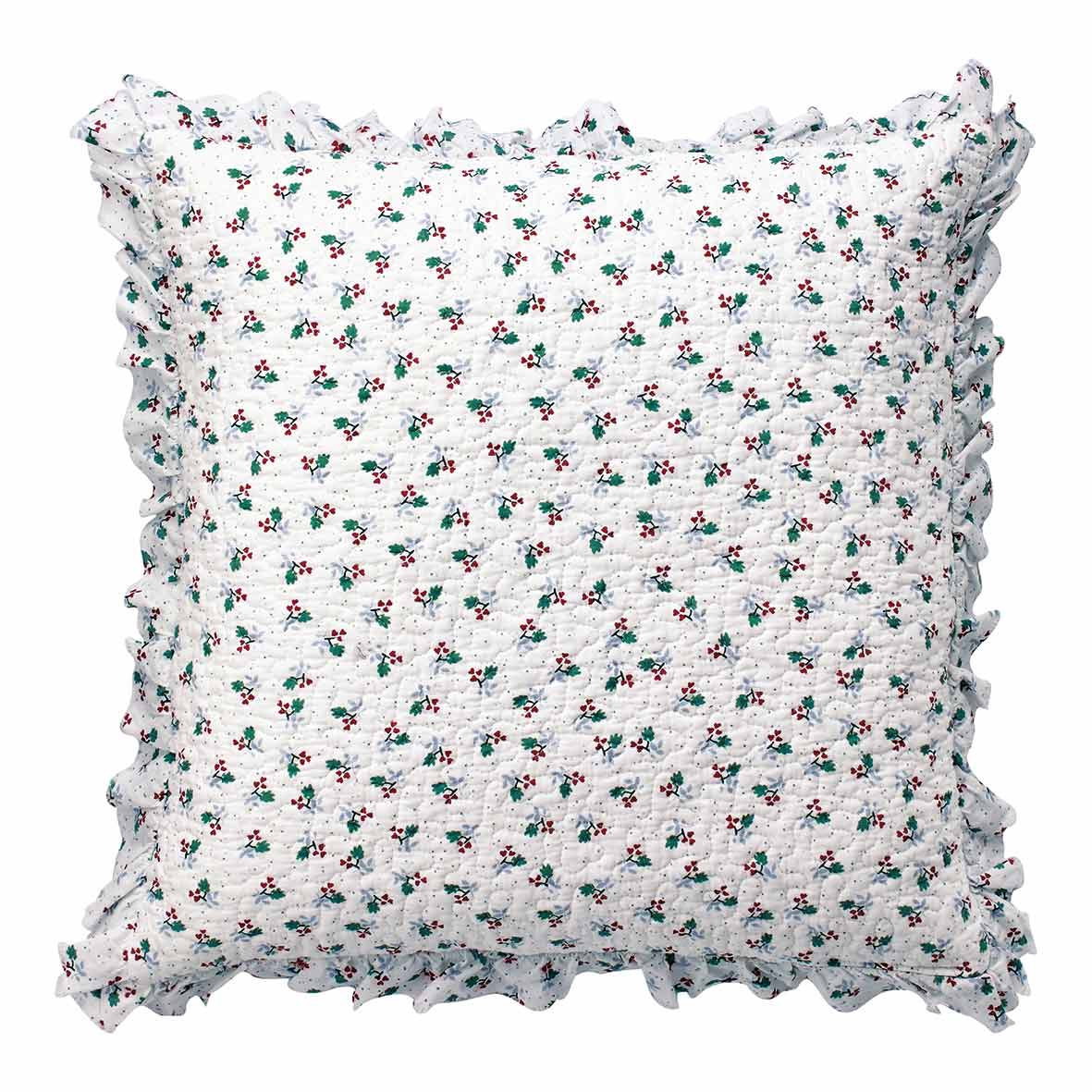 Der quadratische Bezug misst ca. 50 × 50 cm und besteht aus weicher Baumwolle mit zarter Wattierung. Das Muster aus kleinen grünen Blättern und roten Beeren ist typisch für die Joselyn‑Serie und erinnert an verschneite Wintergärten. Eine umlaufende Rüsche verleiht dem Kissen einen verspielten Touch. Dank praktischem Reißverschluss lässt sich der Bezug leicht abnehmen und waschen.
