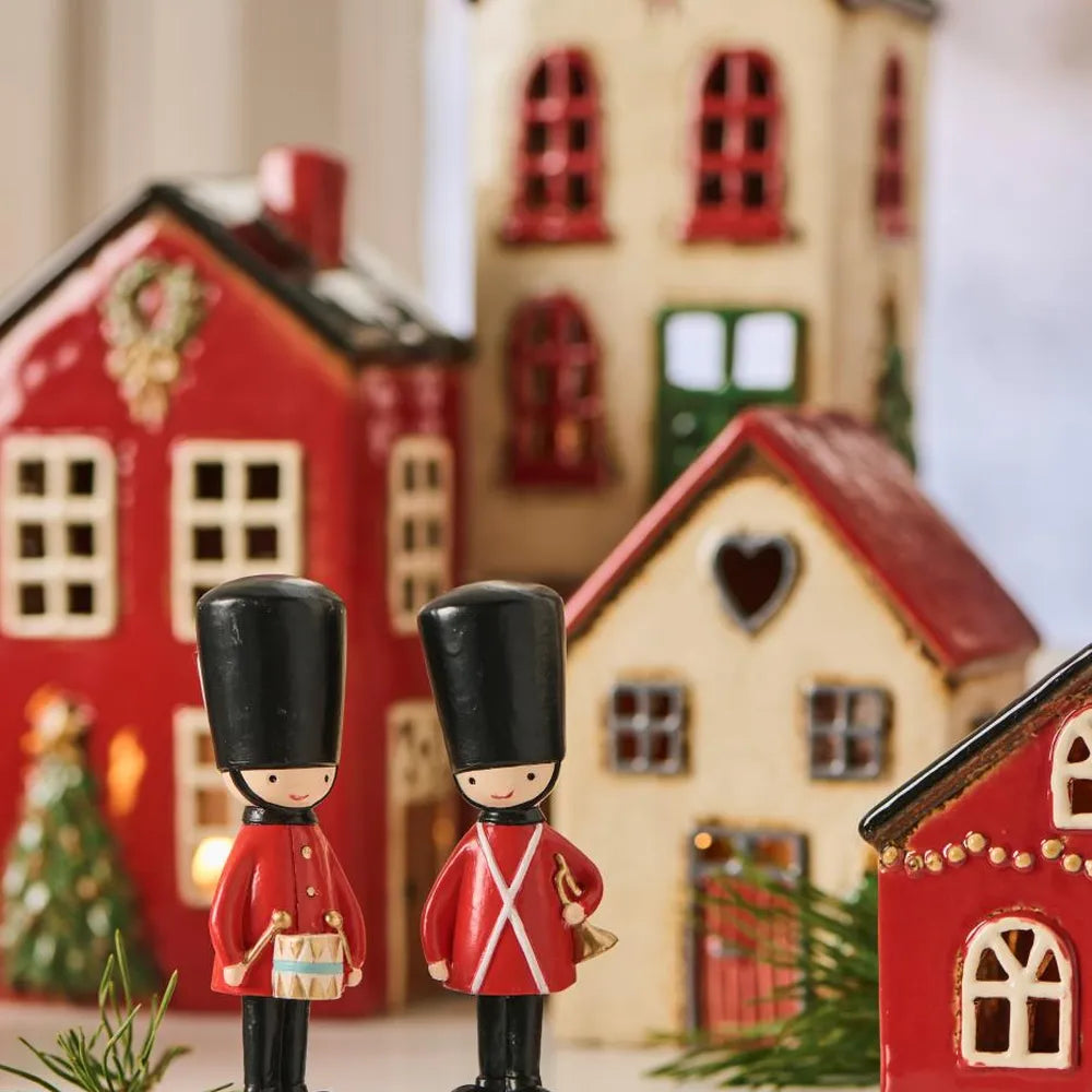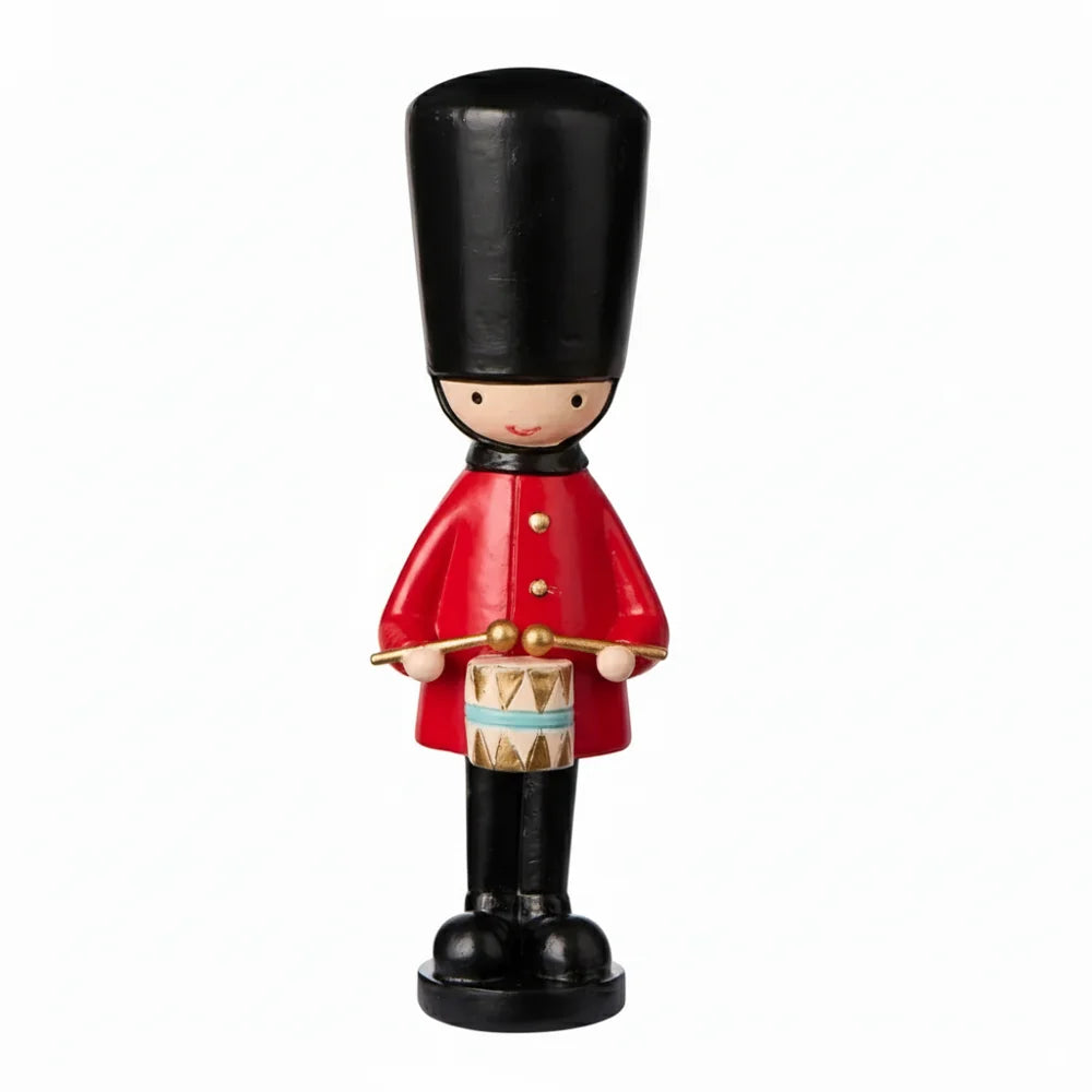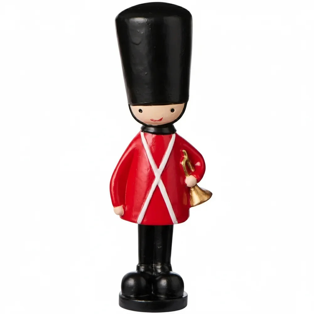 Jeder Gardist trägt eine rote Uniform mit weißen Gurten, einen hohen schwarzen Hut und goldene Details. Der eine hält stolz eine Trommel, der andere eine Trompete – perfekt für einen kleinen Aufmarsch auf deinem Kaminsims.