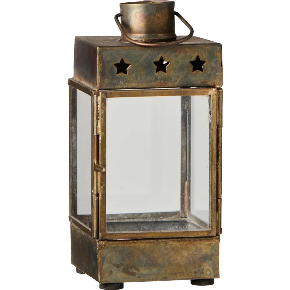 Die Laterne besticht durch ihre sternförmigen Ausschnitte auf zwei Seiten und ihre liebevoll gealterte Oberfläche. Transparente Glaswände sorgen für einen freien Blick auf das flackernde Licht, während der stabile Metallrahmen und der Fuß sicheren Halt bieten. Ein praktischer Henkel lädt dazu ein, die Laterne nach Lust und Laune umzusetzen oder aufzuhängen.