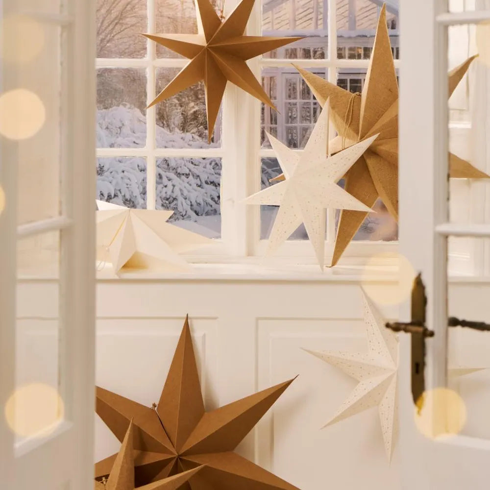 Kombiniere den weißen Stella-Stern mit weiteren Papiersternen in warmen Brauntönen. So entsteht ein natürlicher Kontrast, der deine Weihnachtsdeko noch gemütlicher wirken lässt. Ob am Fenster, an Türen oder frei im Raum – dieser Stern wird überall zum Blickfang.