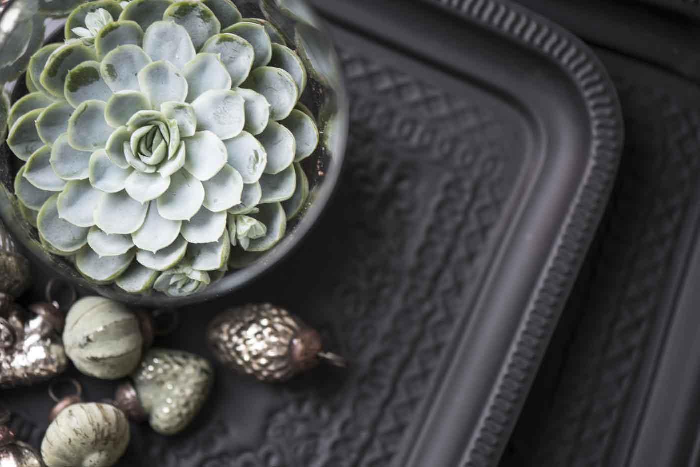 Kombiniere das schwarze Tablett mit goldenen oder messingfarbenen Accessoires, um einen spannenden Kontrast zu schaffen. Besonders schön wirkt es als Kerzentablett: Ordne unterschiedlich hohe Stumpenkerzen und ein paar Tannenzapfen darauf an und schon hast du ein stimmungsvolles Arrangement. Zur warmen Jahreszeit kannst du es mit frischem Obst und einer Karaffe in Szene setzen – nordische Leichtigkeit trifft auf gemütliche Landhausromantik.