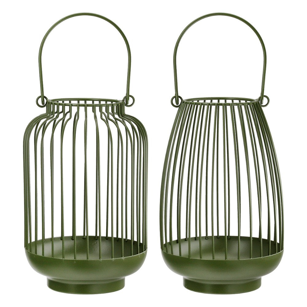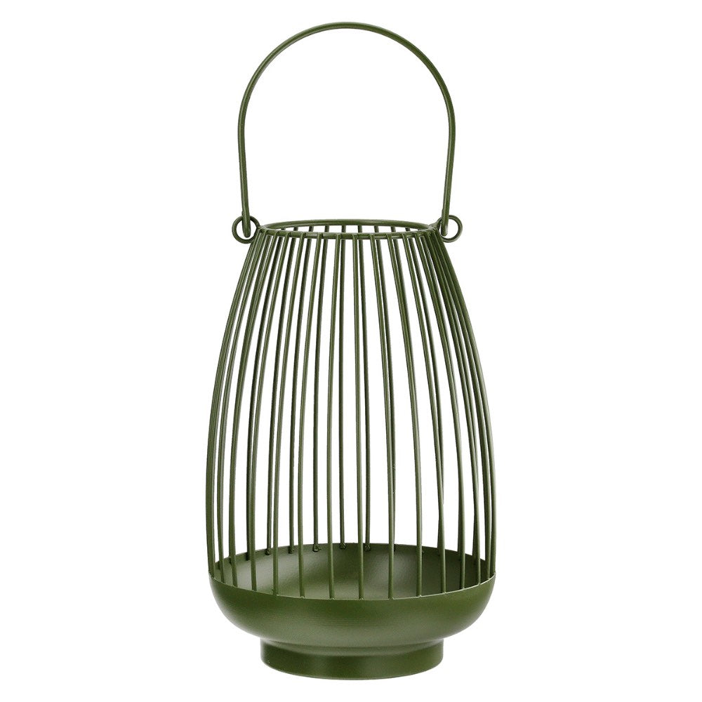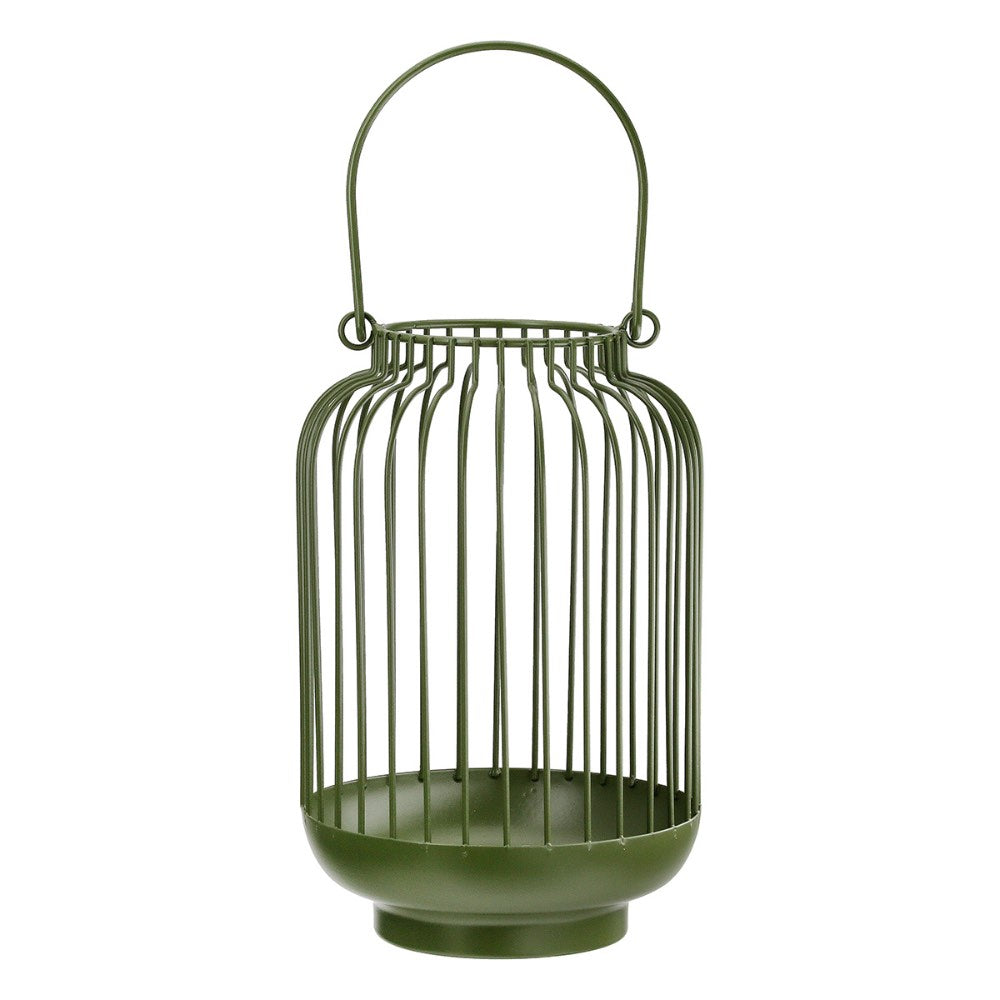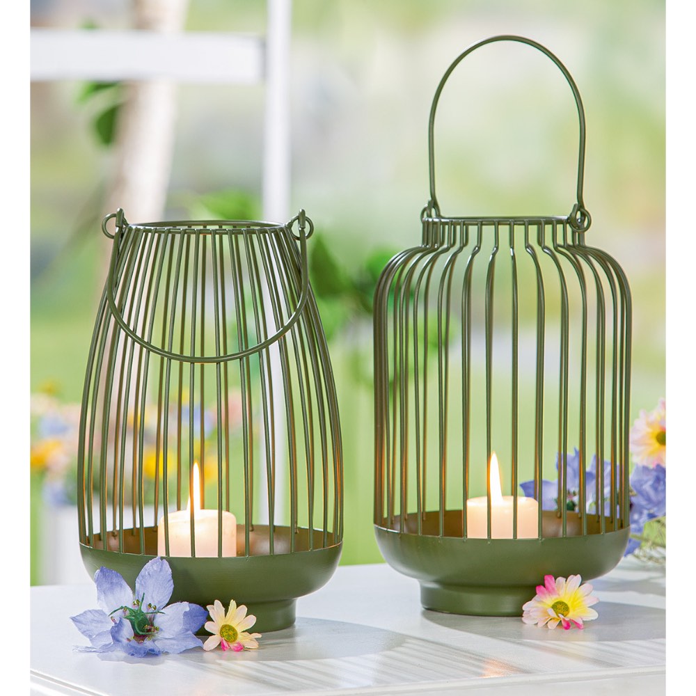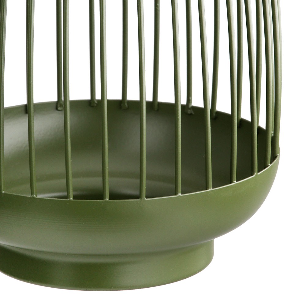 Bestücke den Leuchter mit einer cremefarbenen Stumpenkerze. Das warme Licht bildet einen traumhaften Kontrast zum dunklen Grün des Metalls und lässt die Schatten der Streben sanft an deinen Wänden tanzen.