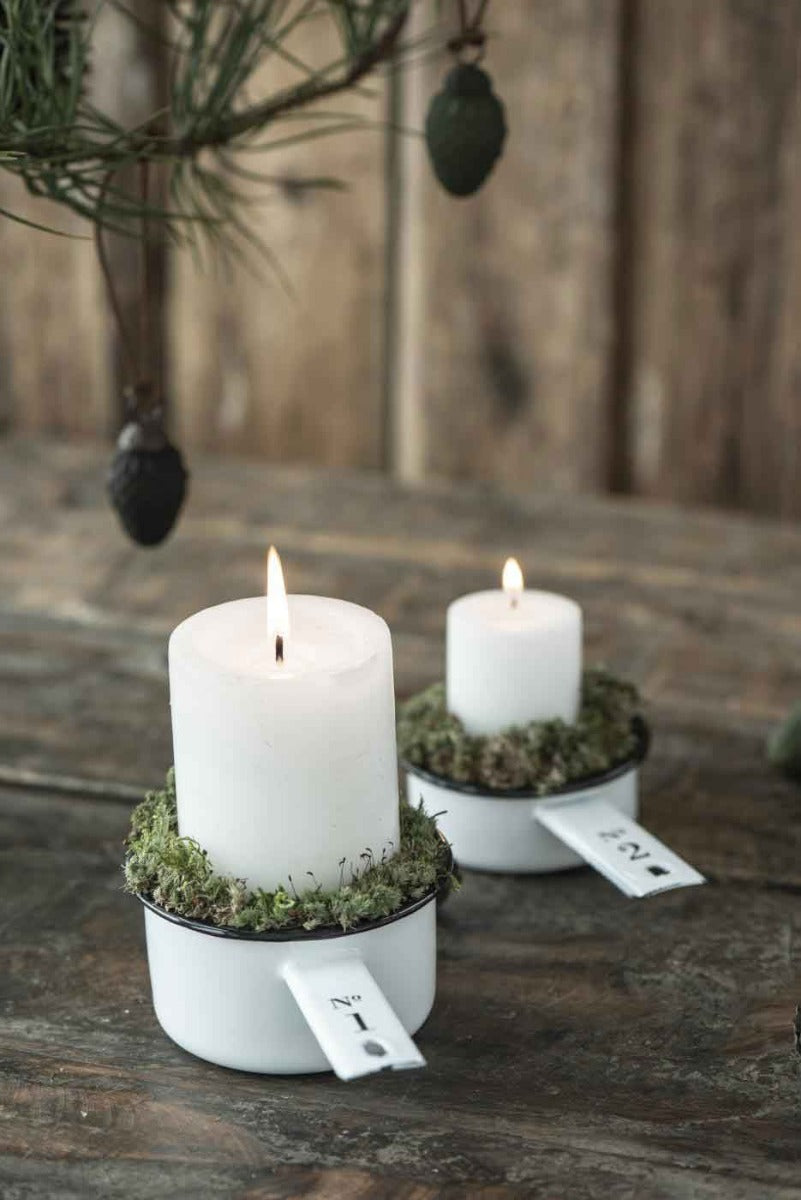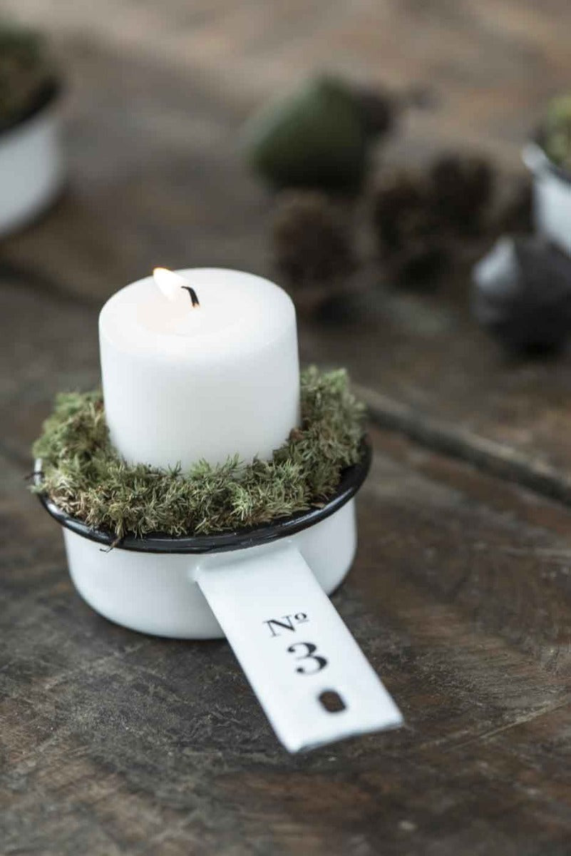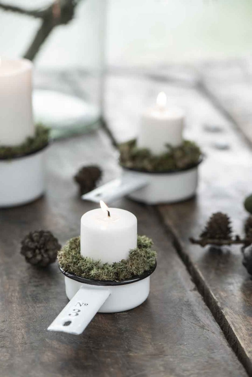 Setze die Kerzenhalter auf ein rustikales Holzbrett und umrahme sie mit Tannenzweigen, getrockneten Orangenscheiben und Zimtstangen – so entsteht ein natürlicher Adventskranz. Nach der Weihnachtszeit können die Becher als kleine Vasen oder für Teelichter genutzt werden.