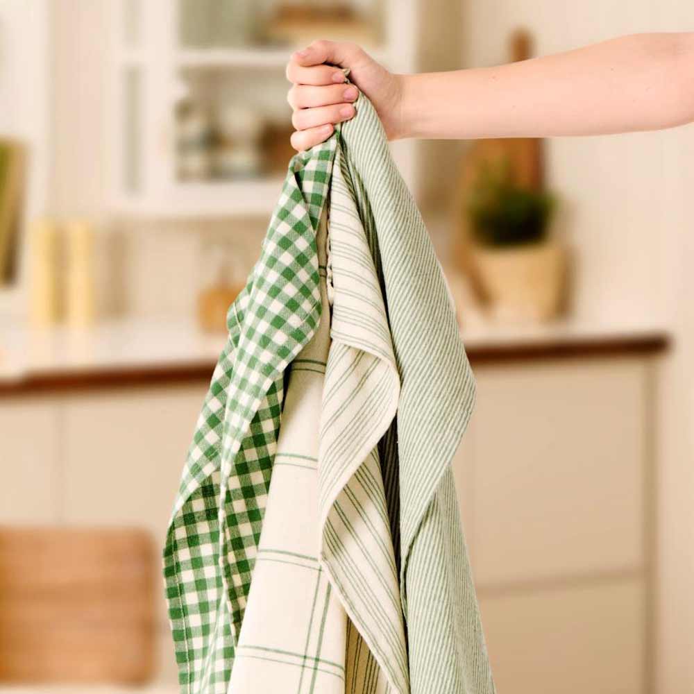 Die feinen vertikalen Streifen in hellem Grün verleihen dem Tuch eine zeitlose Optik, während die praktische Schlaufe zum Aufhängen für zusätzlichen Komfort sorgt. Langlebig und pflegeleicht, ist es bei 40 °C waschbar und ideal für den täglichen Gebrauch.