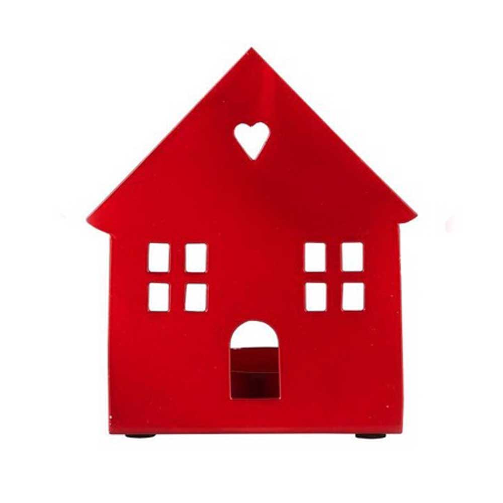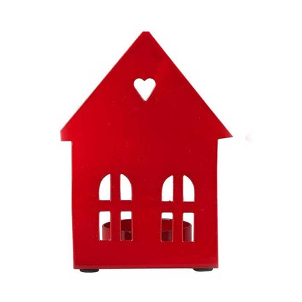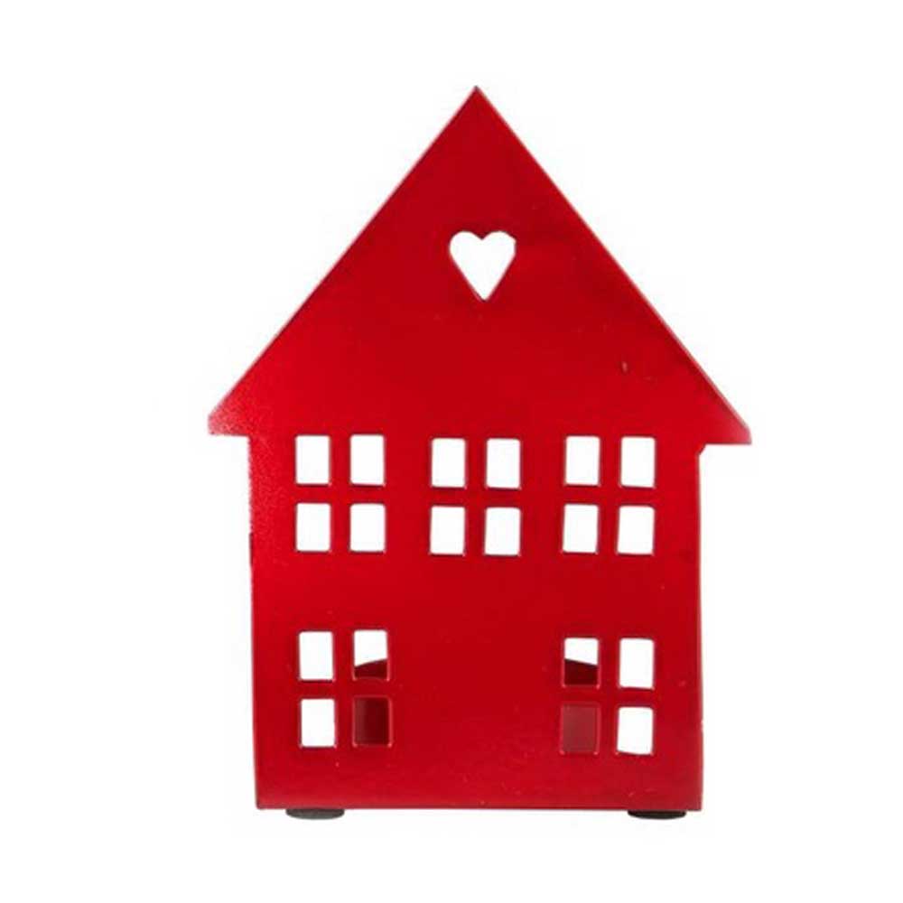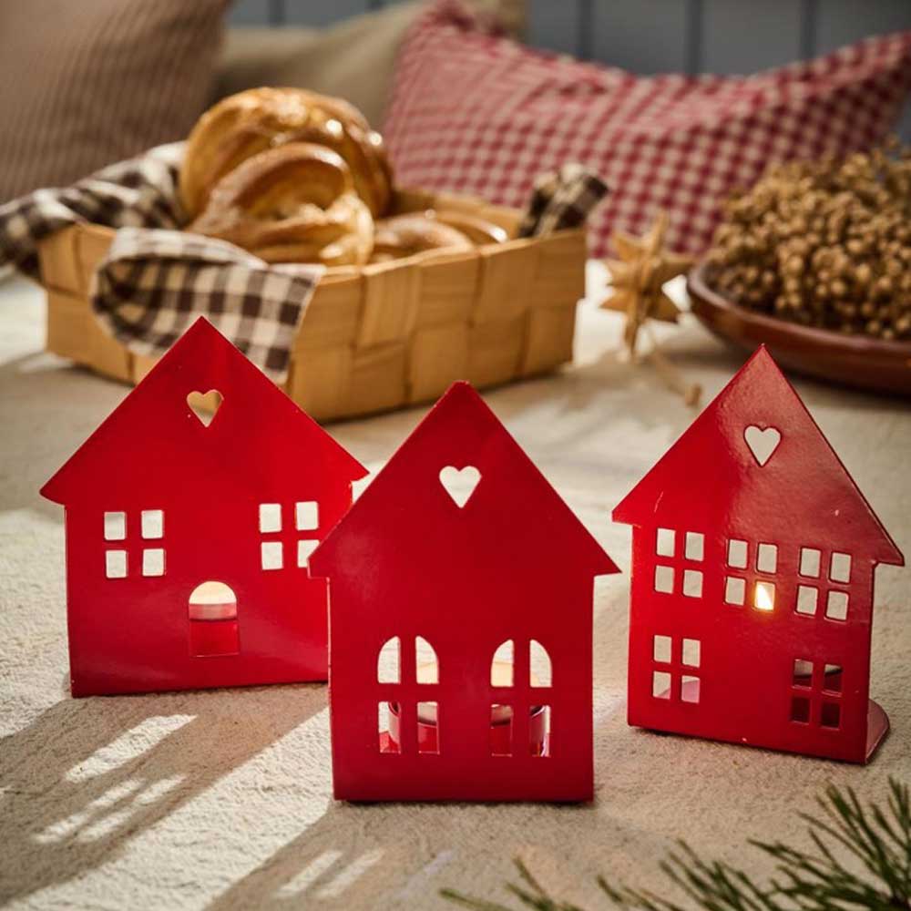 Mit drei unterschiedlichen Hausfassaden-Designs kannst du eine charmante kleine „Straße“ kreieren. Die ausgeschnittenen Fenster und Türen sowie das herzförmige Detail im Dachbereich verleihen jedem Haus seine eigene, bezaubernde Note. Gefertigt aus Metall und lackiert, strahlt das Häuschen in einem kräftigen Rot und passt ideal zur Winter- und Weihnachtsdeko.